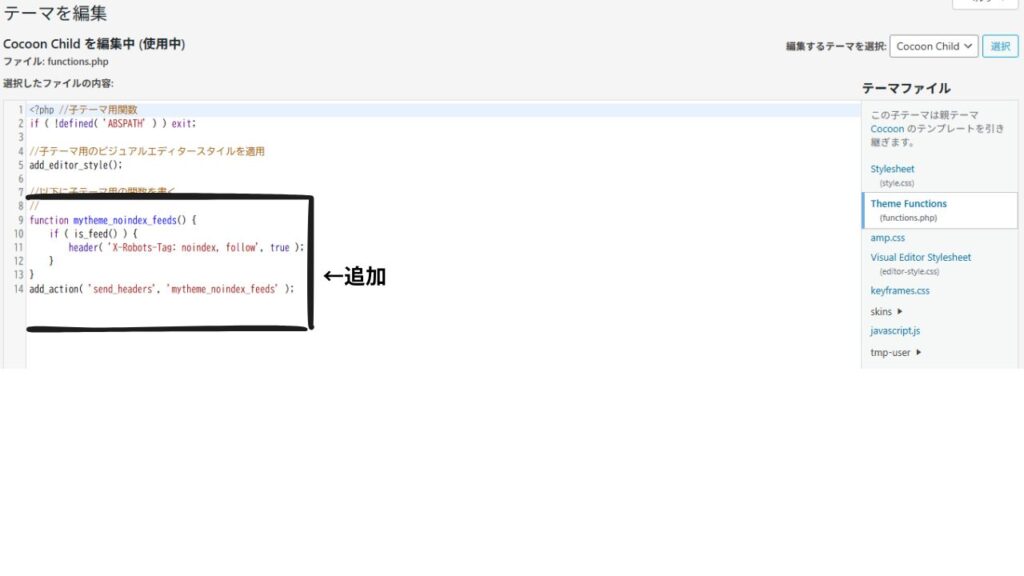 Cocoon子テーマのfunctions.phpに追加。「←追加」の部分が今回のコード
