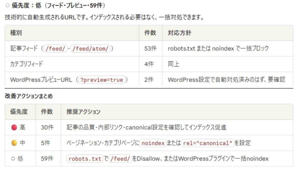 | ⚪ 低(フィード等) | 59件 | noindexで一括ブロック |