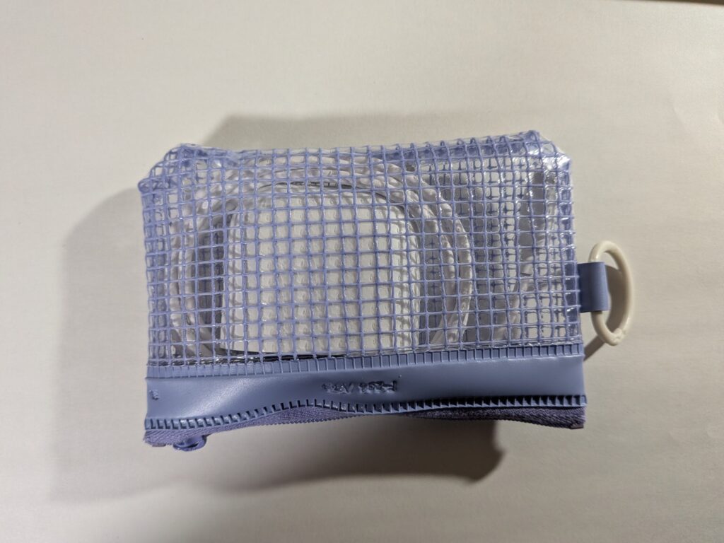 90mm×130mmのチャック付きメッシュケースに充電器と1mのUSB-Cケーブルを入れるとちょうどいっぱいになる感じ。持ち運び用のポーチは別途用意が必要です。